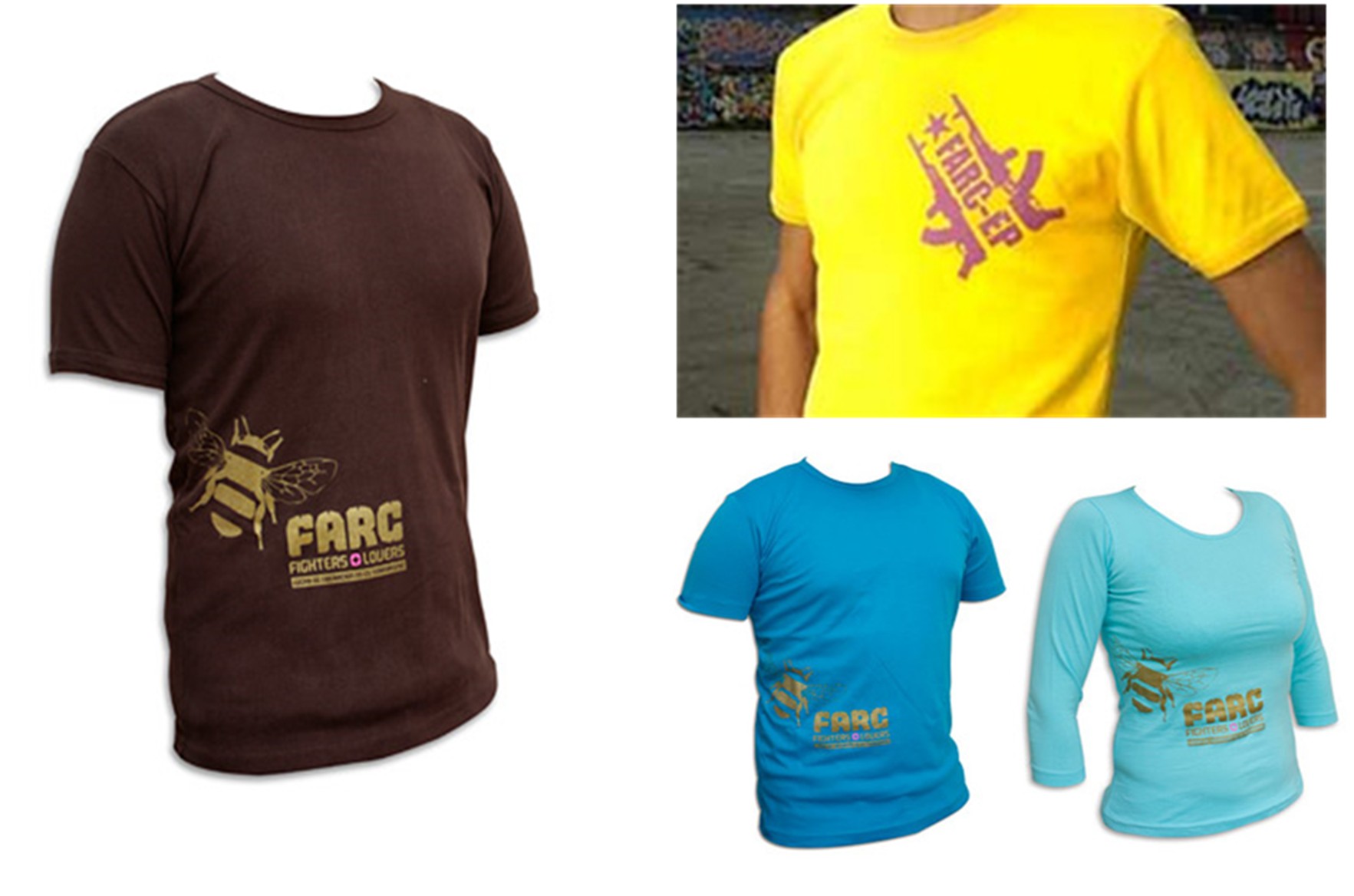- Fighters + Lovers est une entreprise danoise qui fabrique des tee shirt à la gloire des Farc. On croit rêver mais non,  tout est vrai. Ces salopards n'hésitaient pas à faire de l'argent avec les instruments de propagande pour des criminels bajects.  La cour d'appel a fini par condamner légèrement deux des instigateurs. Le site ne donne plus la même propagande éhontée qui était toujours calcquée sur les méthodes stalinienne : on ne dit rien directement mais on fait dire par un compagnon de route, en général un notable dans un pays libre, tout le bien qu'on pense du juste combat des héroiques révolutionnaires.Imaginons un instant qu'un site de propagande nazie ait mis en vente des tee shirt à la gloire de Goebbels et de Hitler  avec un long texte de propagande d'un professeur d'université ! L'immense scandale ; l'élimination ignominieuse du professeur félon etc.  Dans notre affaire : silence sur toute la ligne.